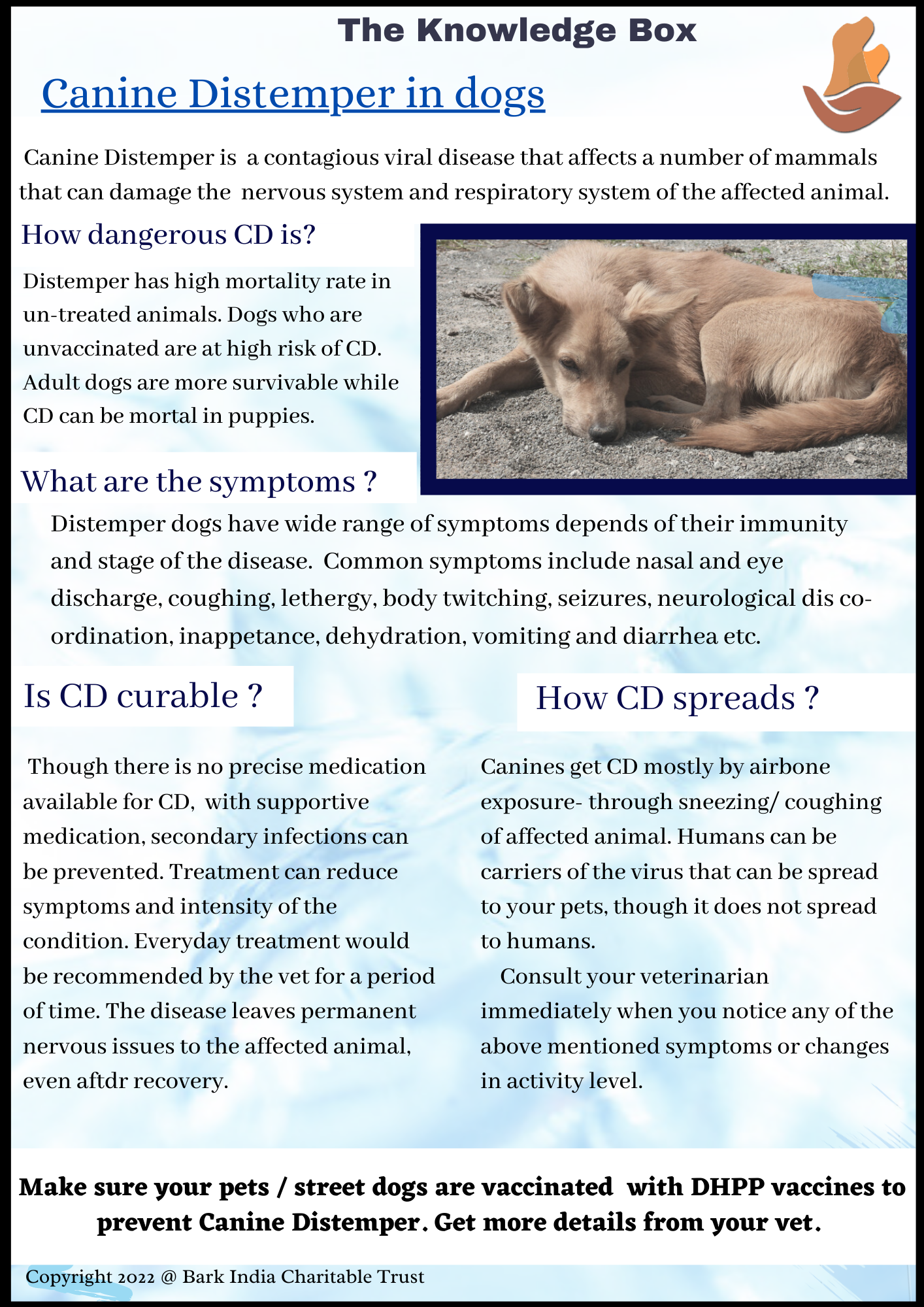 March 9, 2022March 9, 2022Blog, dog treatment, VaccinationsBarkIndia TeamCanine Distemper in dogs- things you should knowCanine Distemper- symptoms, causes, does and don’ts, curability, how spreads, diagnosis and treatment