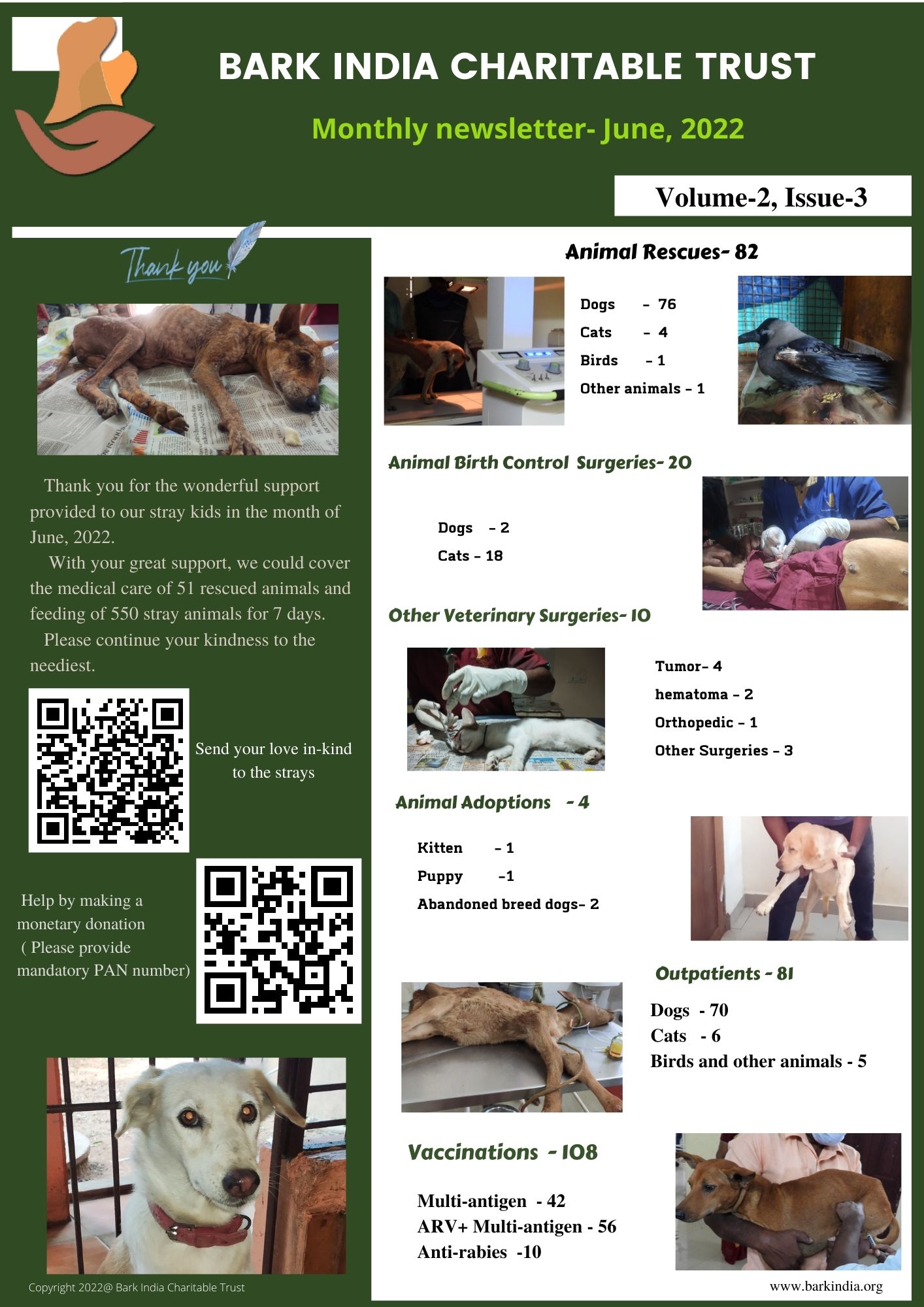 Thanks to each and everyone helped us serving the neediest stray animals in the month of June, 2022. Your in-kind gifts and monetary donations has helped us