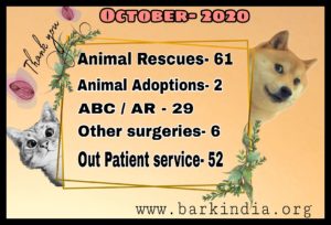 Bark India Charitable Trust is happy that we helped 61 animals ( 1 cat, 1 bird, 59 dogs) by providing them medical care at our veterinary hospital and rescue centre. 2 animals got adopted to new families, 29 animals got sterilised and vaccinated against Rabies, 6 surgeries ( orthopedic and tumor) were done and 52 animals were treated on outpatient service.