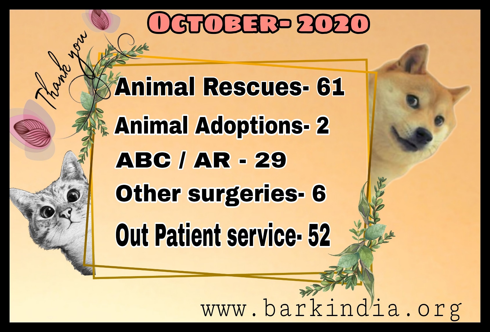 Bark India Charitable Trust is happy that we helped 61 animals ( 1 cat, 1 bird, 59 dogs) by providing them medical care at our veterinary hospital and rescue centre. 2 animals got adopted to new families, 29 animals got sterilised and vaccinated against Rabies, 6 surgeries ( orthopedic and tumor) were done and 52 animals were treated on outpatient service.