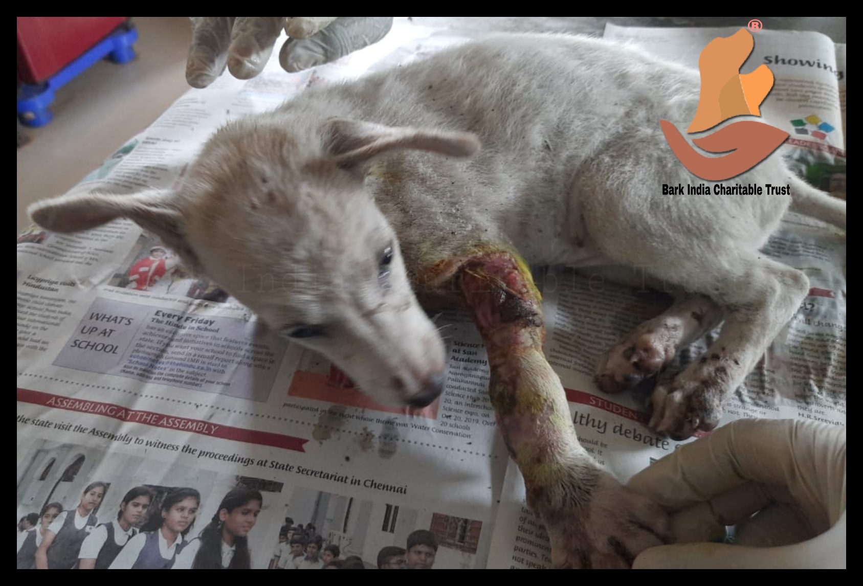This puppy had an accident and with broken leg, found at Saram, Puducherry. Informed by Mr Sira, Mr Venkatesh, an animal lover and rescuer, spotted her on our request. The puppy got admitted in our rescue centre and under medical care.