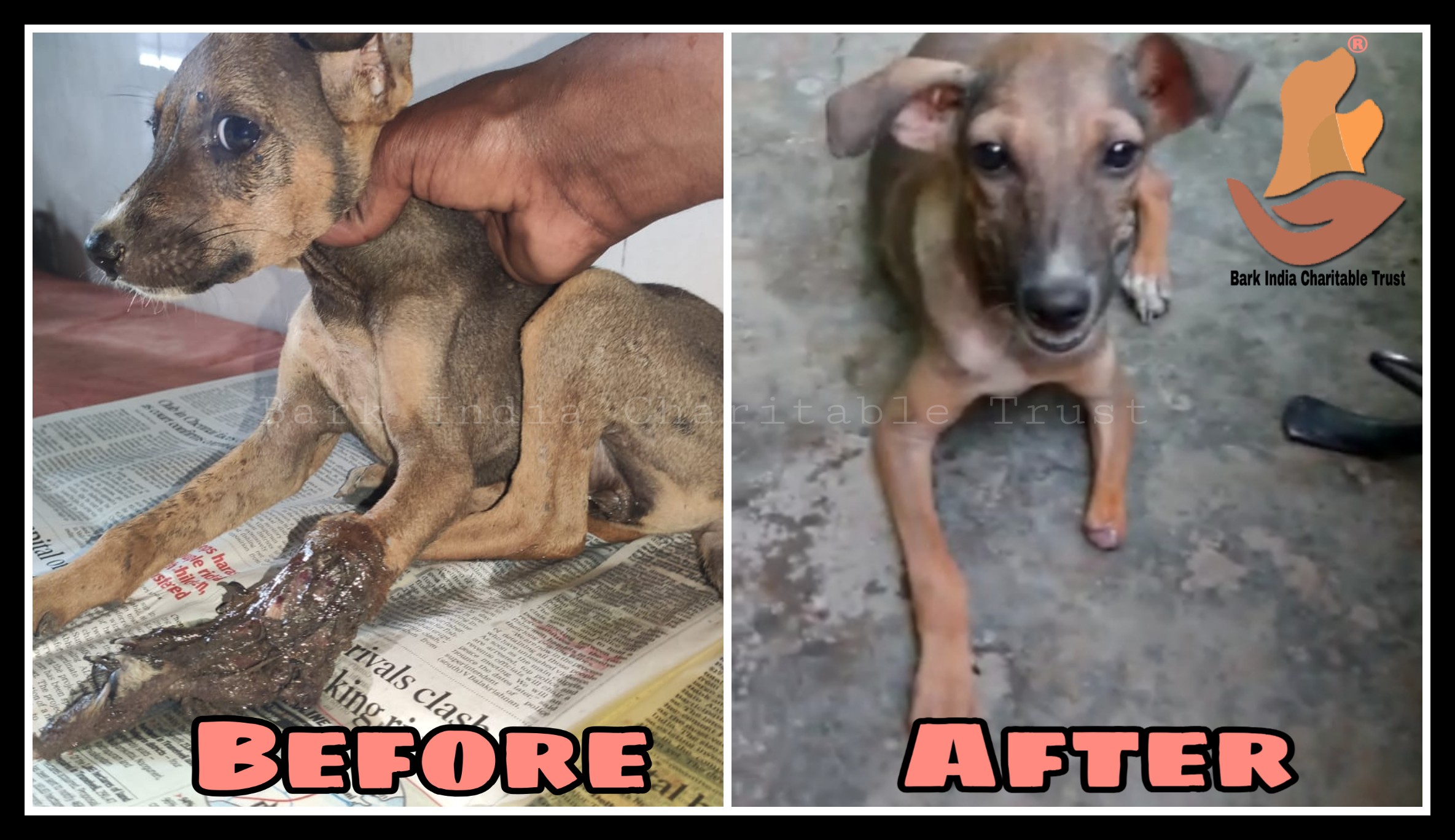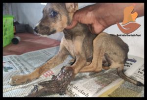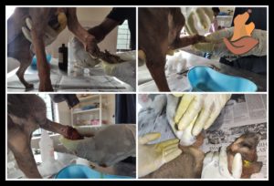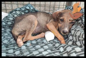 With stench emitting leg, she was taken to Bark India hospital by the kind family. By the time, the leg below the elbow was completely festered . She got admitted at Bark India rescue centre for treatment. Her wound is cleaned and after first aid, she had food and vitamin supplements.
