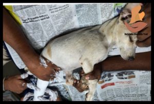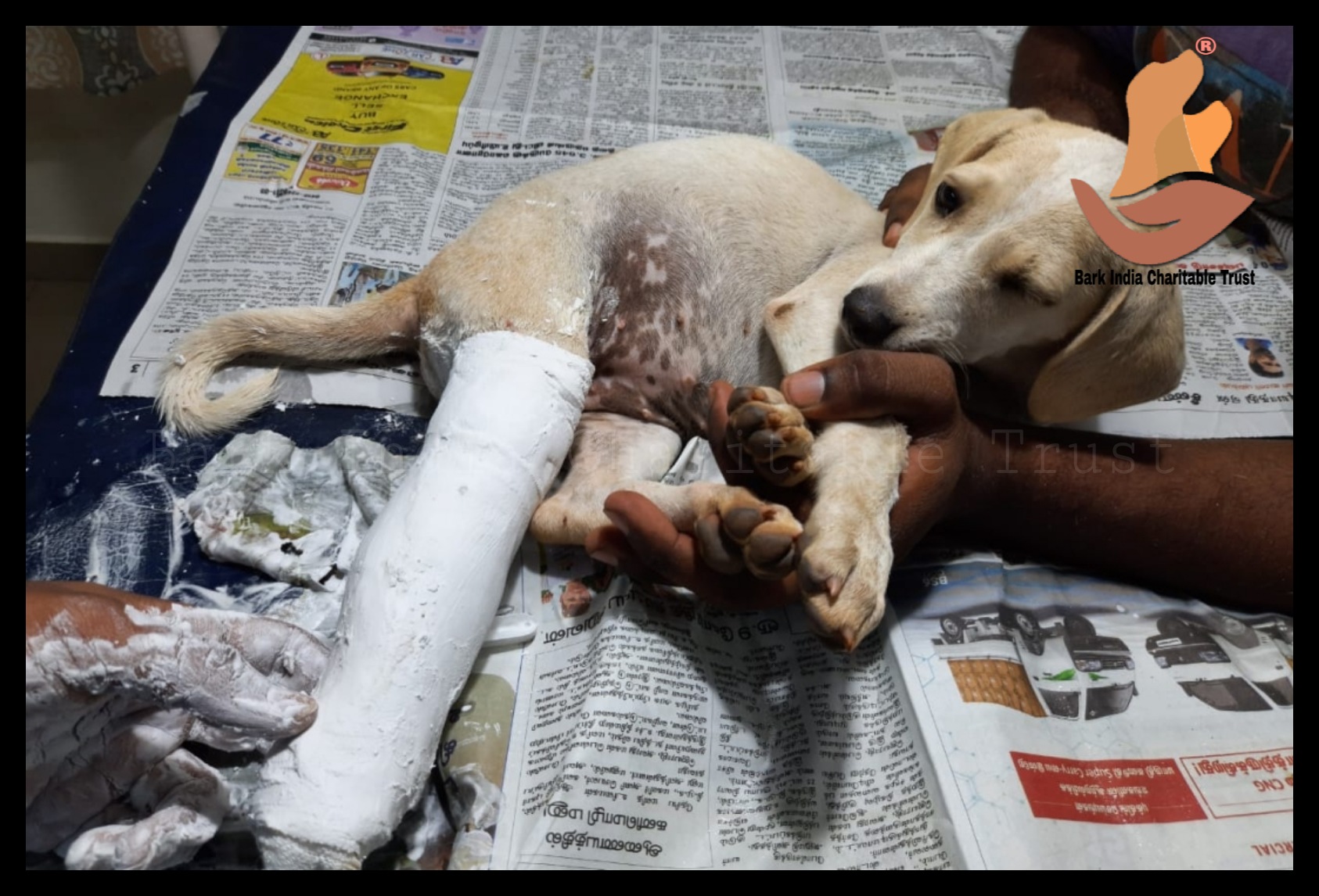 This cute girl got rescued from Vasanth Nagar, Muthialpet, Pondicherry , when she had a fracture on hind leg as result of an accident. She was unable to walk and handle herself. Rescued and transported to Bark India veterinary hospital, the puppy gets free medical care and veterinary support to recover.