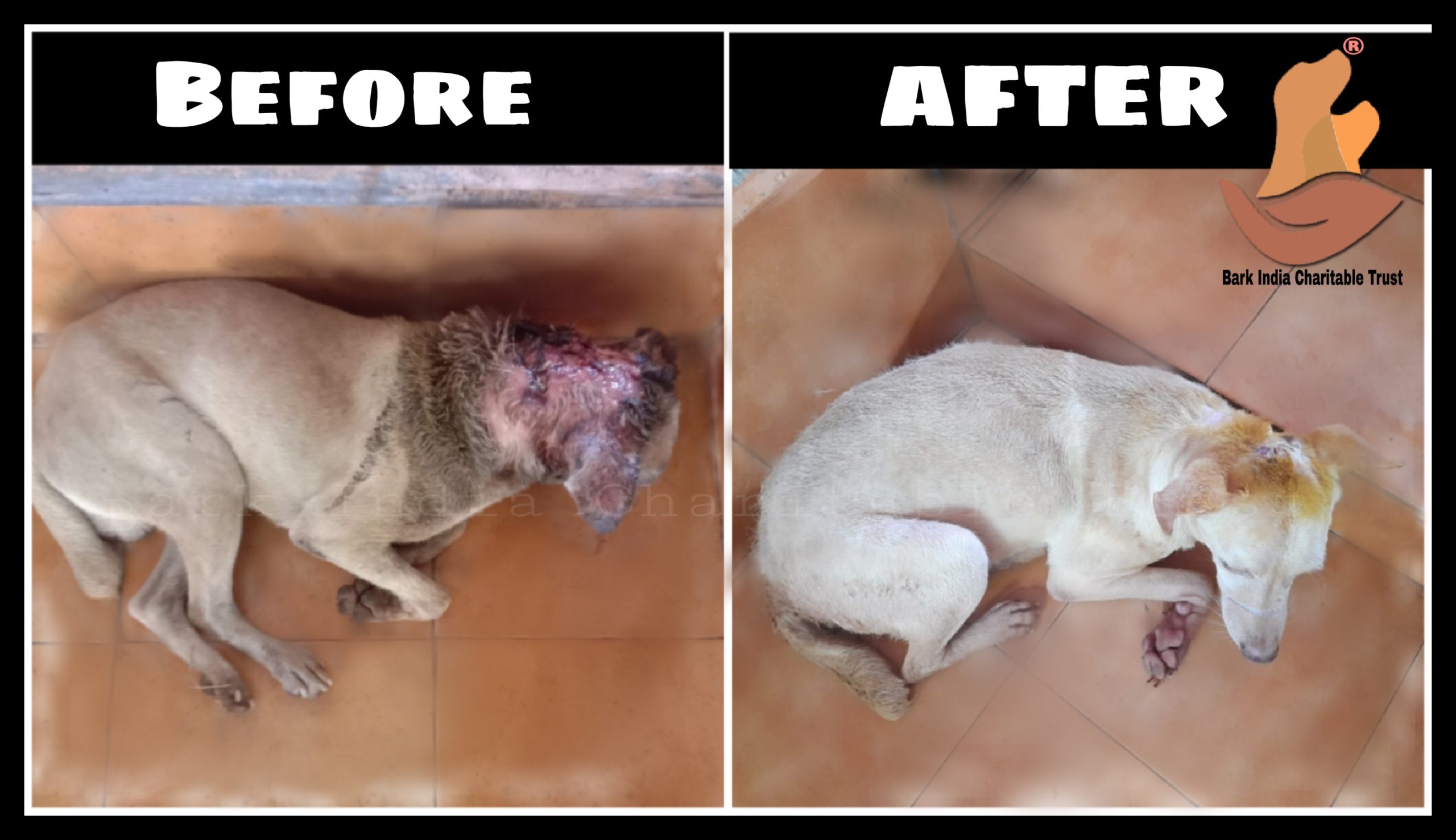 The stray dog rescued from Uppalam, Puducherry, with maggots made wound on neck and head- before and after treatment at Bark India veterinary hospital located at Pattanur, Villupuram district, Tamil Nadu.