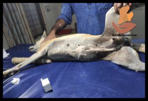 This street dog rescued from Pondicherry beach with fracture on front leg and mammary gland tumor, had a surgery at our veterinary hospital. The tumor is removed by the successful surgery done by veterinary surgeon Dr. Gurunath and Dr. E Vijay.