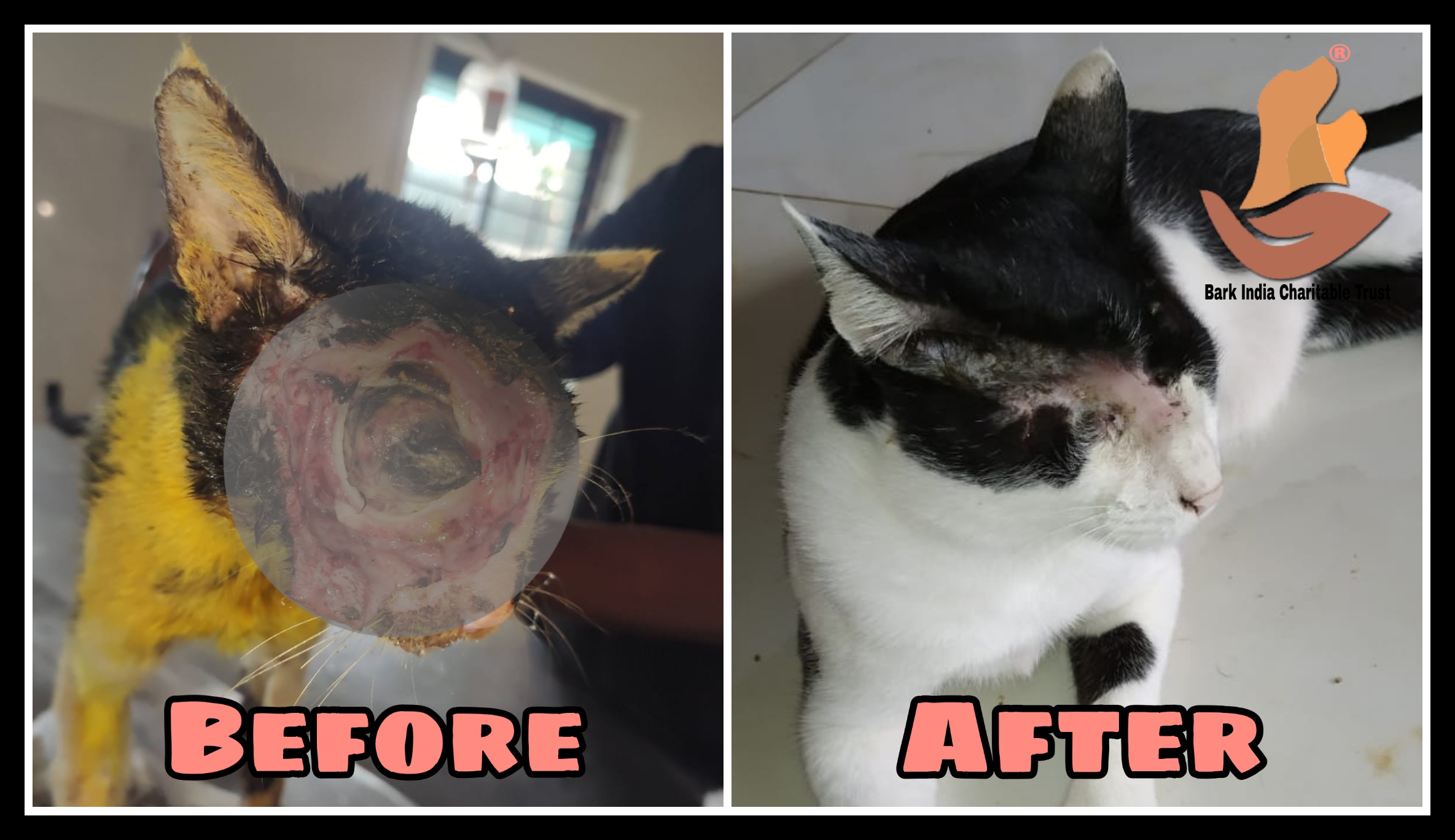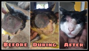 We are very much happy to share the update of the rescued cat- Lucky. Lucky was rescued from Navarkulam, Pondicherry when Bark India rescue team was coming back after a dog rescue. He was sitting on the side of the street with 2/3 of his face was broken and full of live maggots inside.