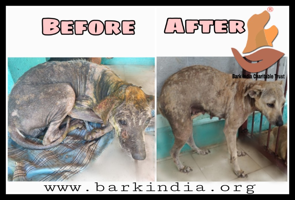 People in her area used to chase her away as she appeared hairless and wounded on head. Seeing this Ms Dheebika Cauvery informed Bark India, and arranged her transportation with Mr Ramesh. The street dog had complete hair loss, mange and a wound on head, when she is admitted at Bark India veterinary hospital. With 2 months of treatment, she made good transformation. Thanks to Ms Dheebika and Ramesh for arranging her transportation.