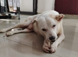 It took nearly a year for Snowy to regain mobility to a great extent. However, due to his condition, he still passes urine and stool involuntarily, making it difficult to find him a home. As a special case, Snowy remained at Bark India, where he now lives happily. His favorite pastime? Chewing on chargers and tables inside the office! With his playful nature and adorable puppy face, he is loved by everyone who visits Bark India.